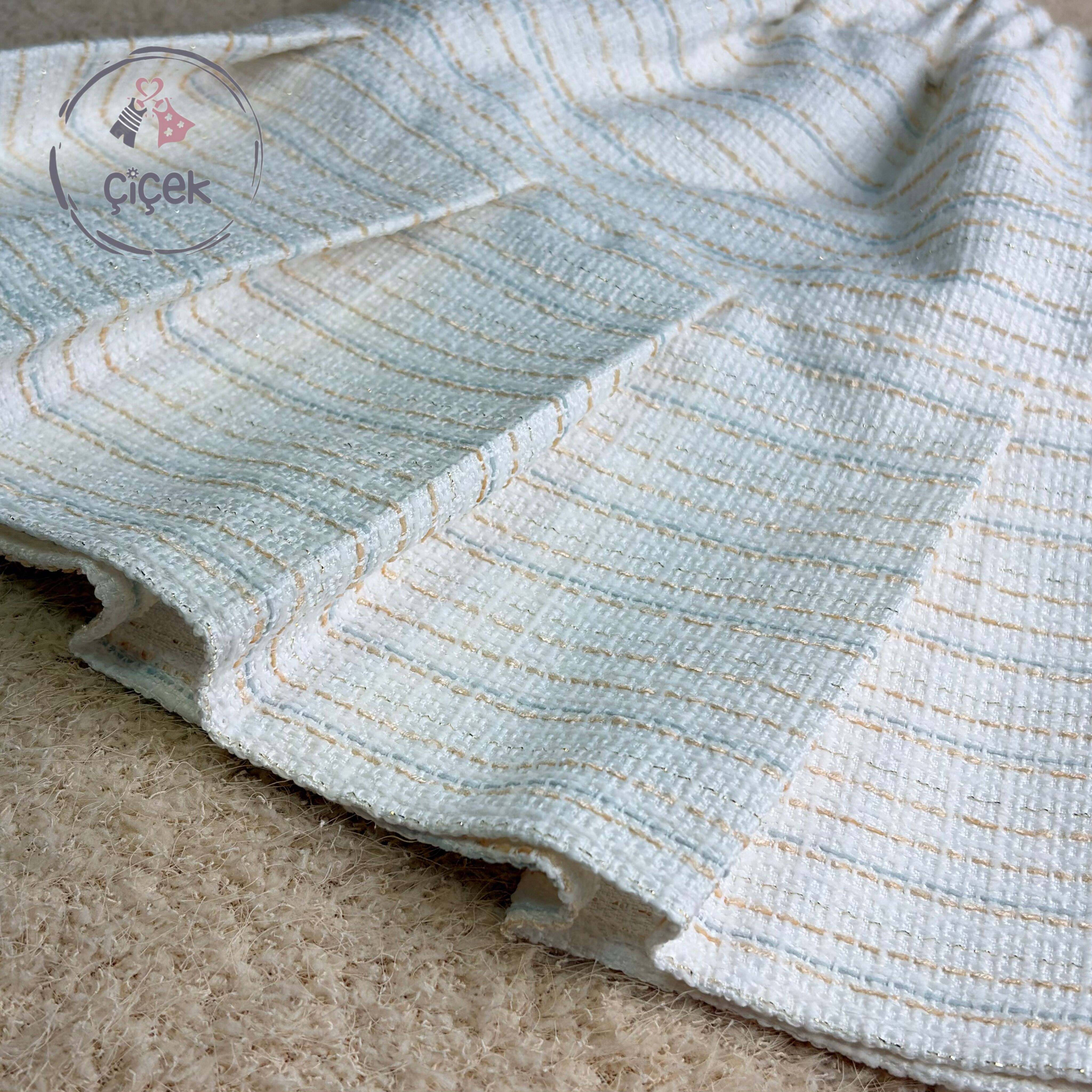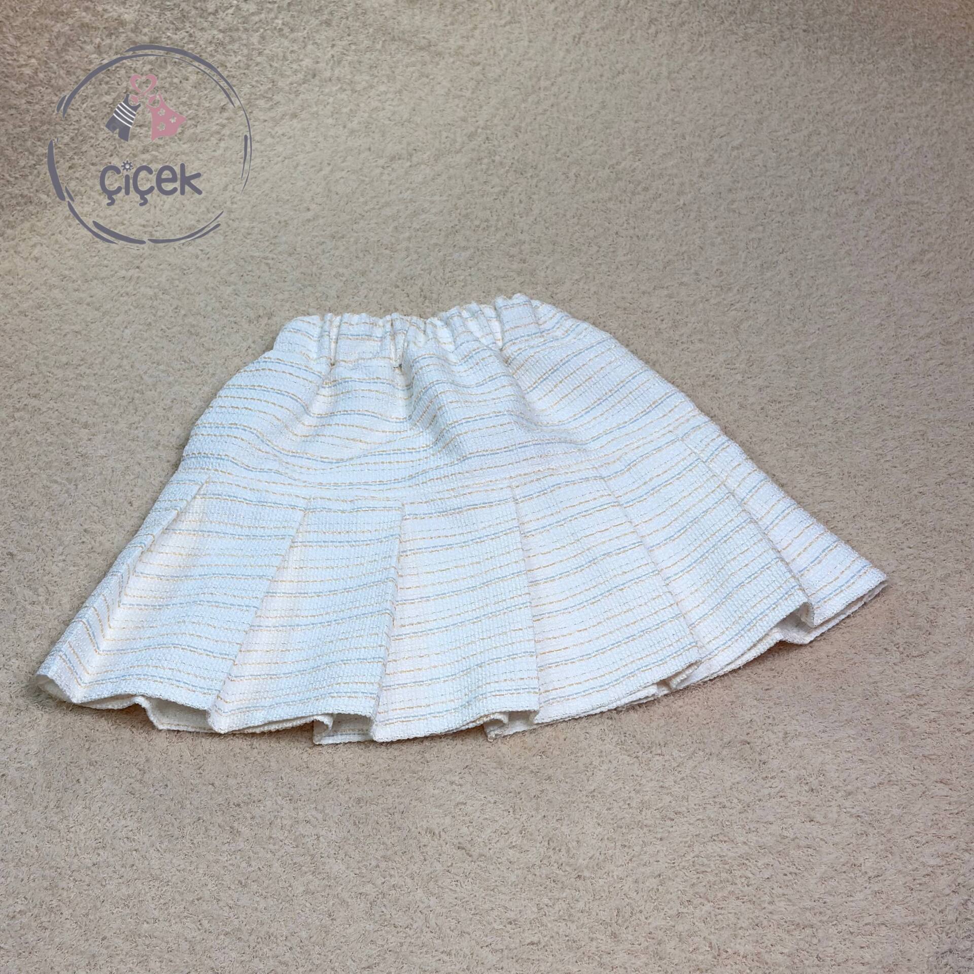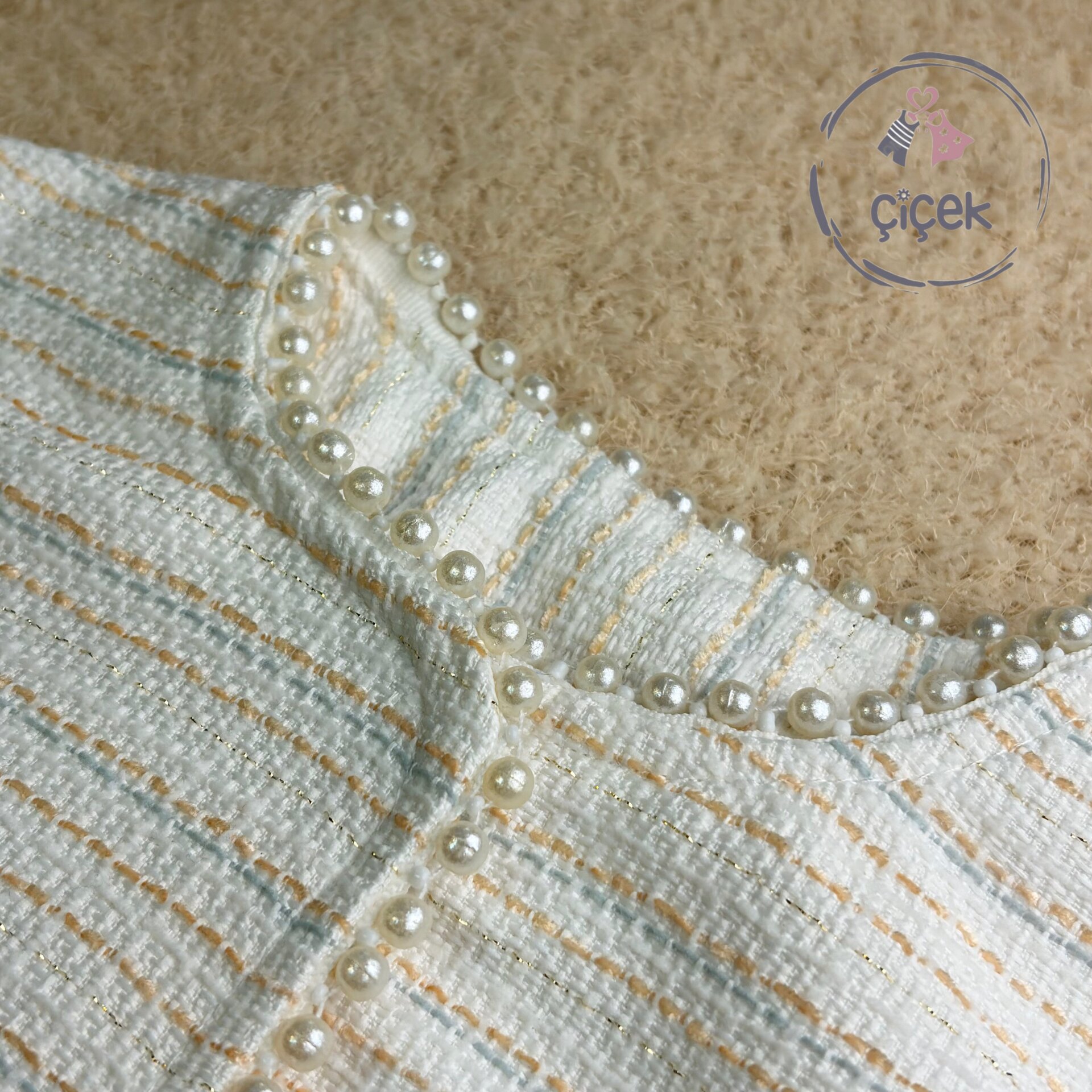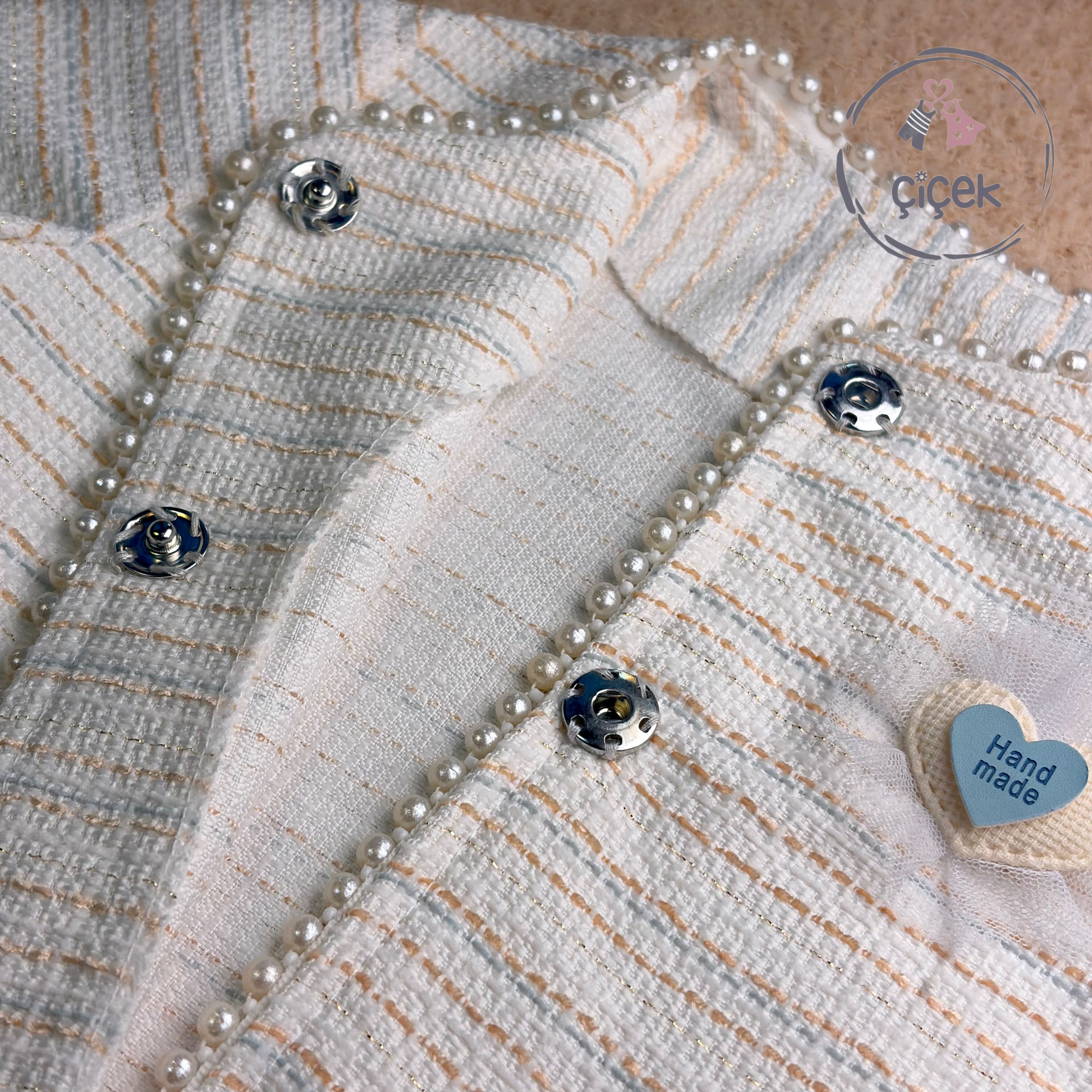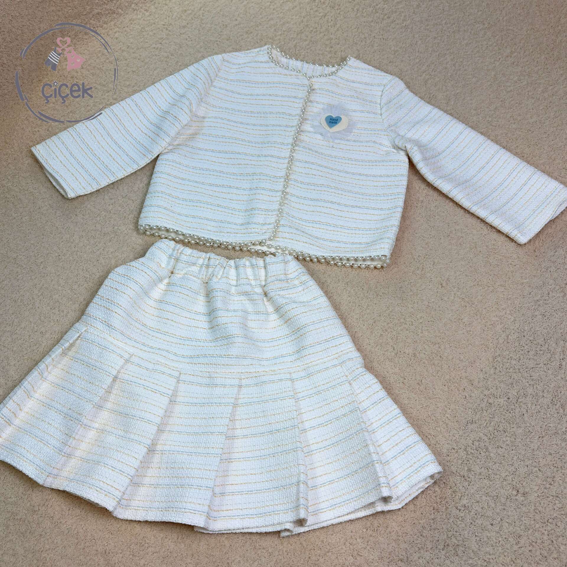 کت و دامن کلادیوم یک انتخاب خاص و منحصربهفرد برای دختران خوشپوش است. جنس کنفی شنلدار این ست، همراه با مرواریددوزی دور یقه و لباس، جلوهای شیک و ظریف ایجاد کرده است. کت دارای دکمههای مخفی بوده و برای زیبایی بیشتر، یک گل سینه هماهنگ به آن اضافه شده است. دامن پیلهدار طراحی شده و با کمر کشی راحتی بیشتری را برای کودکان فراهم میکند.